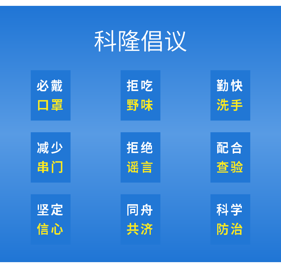 河南科隆新能源股份有限公司總經(jīng)理程迪表示:“疫情爆發(fā)以來,我們時刻關(guān)注疫情發(fā)展動態(tài),想為抗擊疫情承擔一份責任,獻出自己的綿薄力量!同時,我們也將落實國家相關(guān)要求,全力配合疫情防控工作,在公司內(nèi)做好消毒、疫情防控宣傳工作,密切關(guān)注假期期間員工健康情況,為共同抗擊疫情貢獻力量?!?/span>